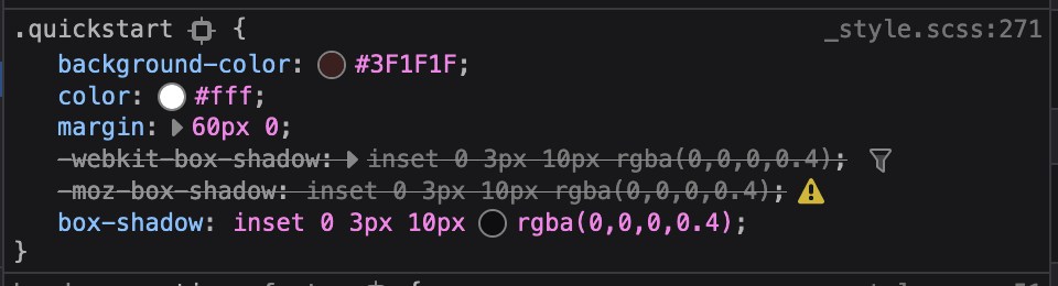 The box title was defined in CSS with margin, padding, border-radius, box-shadow, text-align, text-shadow, font and color. A different style class was assigned to the box content. Besides the various font colors, a different font-family was selected than is used on the remainder of the page which I feel also makes that element stand out more. There is also a media query assigned to the quickstart element. The media query defines that a different font-size is to be used when in a narrower viewport. This led me to play around a little with resizing my display and I could see that this website was built using the Mobile First design theory.